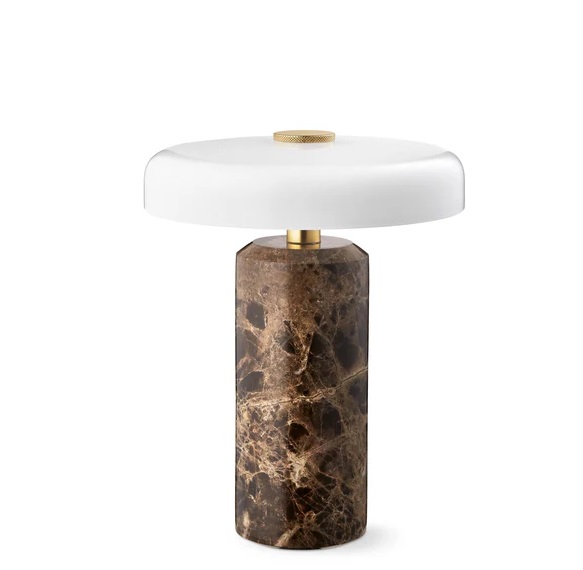 Lampa stołowa Trip Dark Emperador zachwyca eleganckim połączeniem naturalnego marmuru i szkła, tworząc ponadczasową i wyrafinowaną formę o dekoracyjnym charakterze. Ciemnobrązowa podstawa z charakterystycznym, żyłkowanym rysunkiem kamienia nadaje jej unikalności, a klosz ze szkła dmuchanego ustnie i ręcznie malowanego podkreśla rzemieślniczą jakość wykonania.